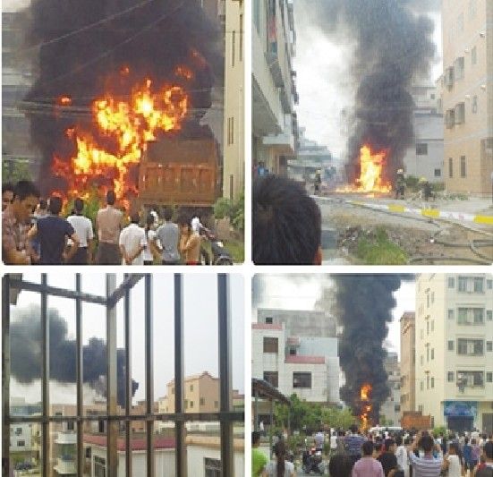 据目击事故全过程的梁女士透露,“事发时间大概在下午5时15分左右,当时自己正在屋内玩电脑,突然听到窗外有居民喊‘着火了’,便跑出窗外查看。没想到,不足两分钟,油罐车的火苗就蹿到车厢,后引发爆炸。只听到一阵巨响,火苗一下就蹿至7层楼高,现场散发滚滚浓烟。”